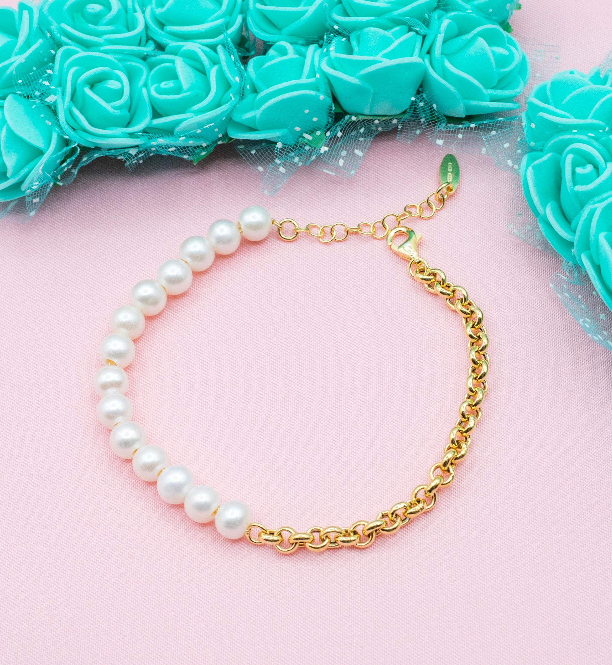 Bracciale a Fantasia da Donna Metà Perla Metà catena in Argento 925 dorato. Perle tonde di coltura dolce.