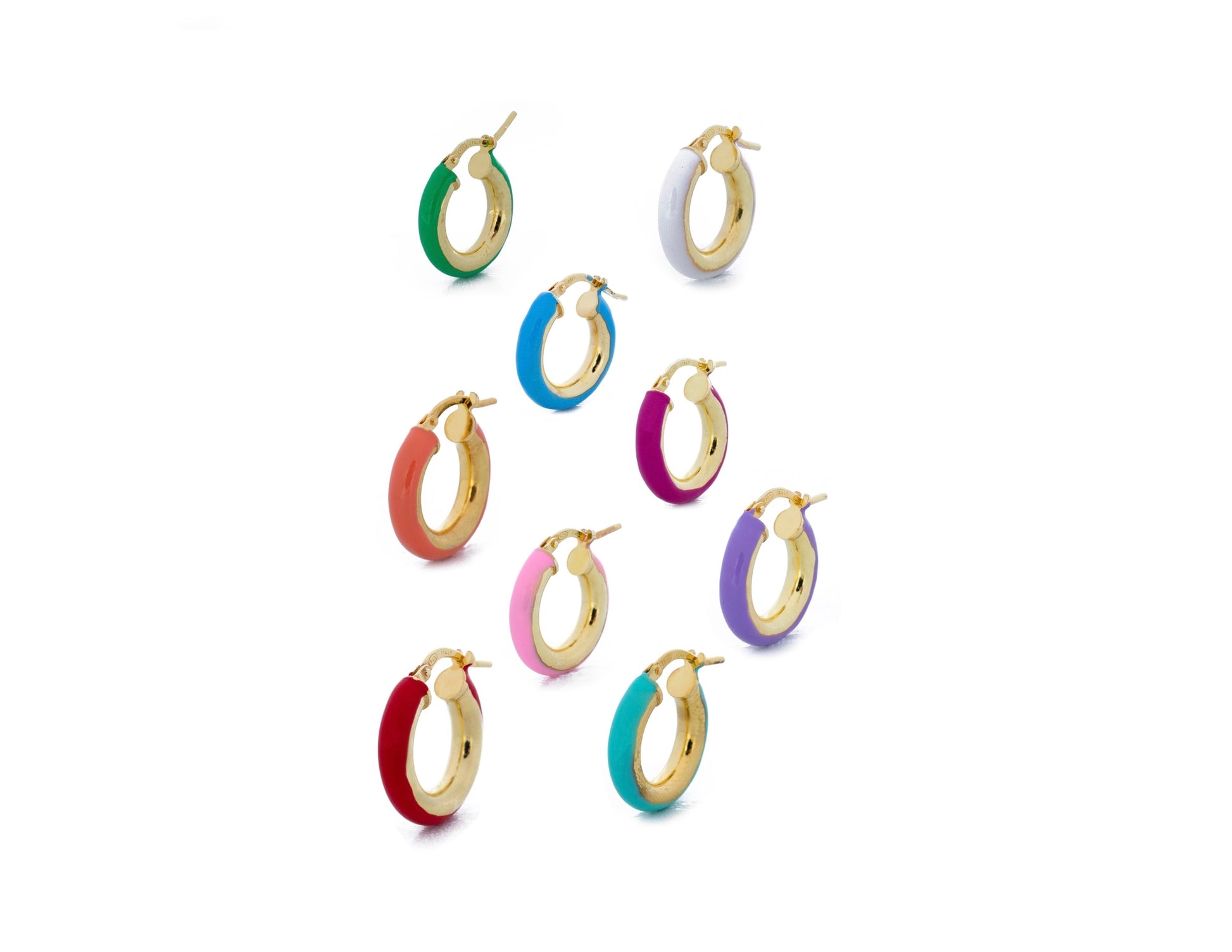 Orecchini a cerchio in argento 925 bagnato in oro giallo con finitura lucida laccata di vari colori.
