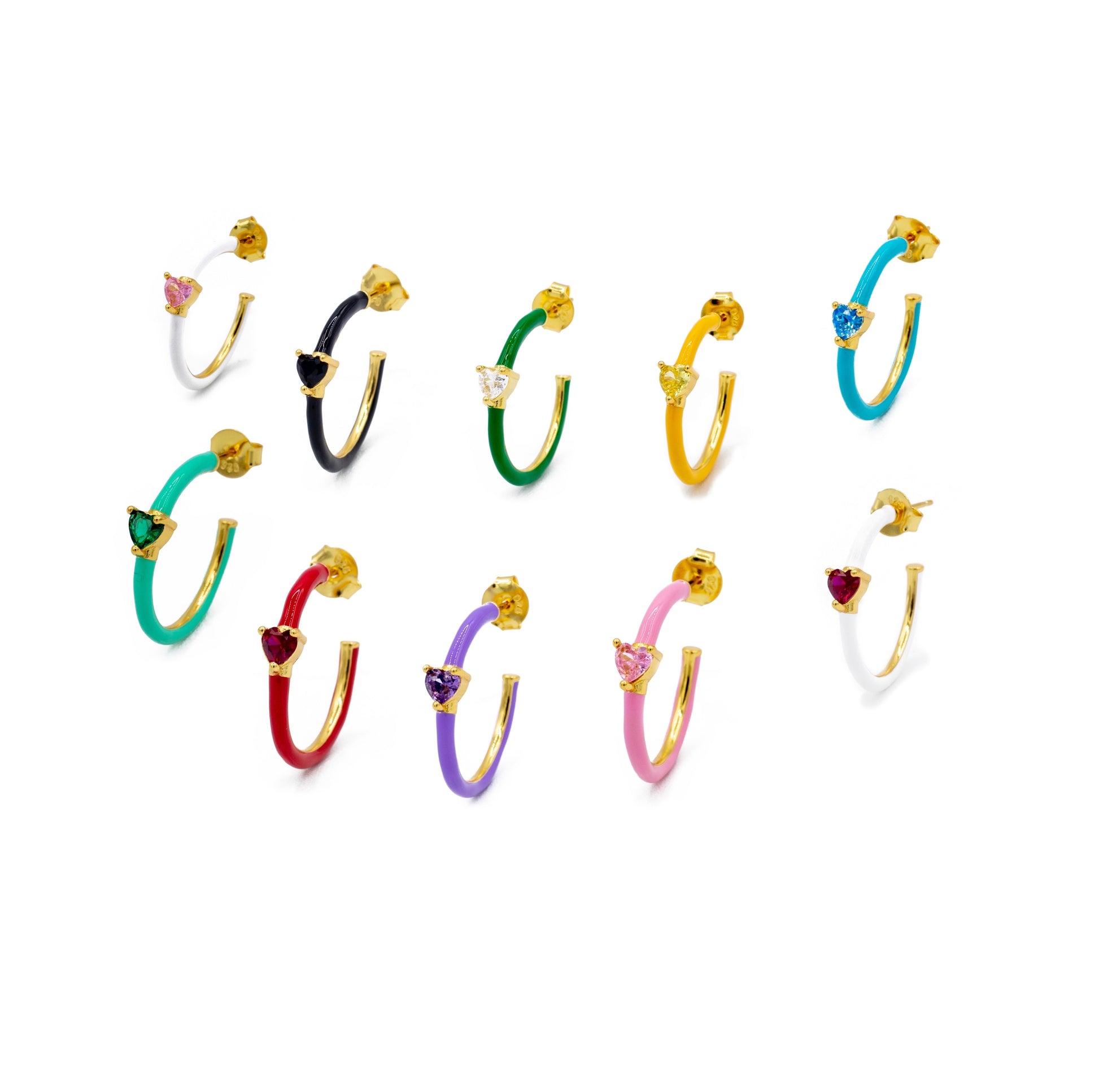 Orecchini a cerchio in argento 925 bagnato in oro giallo con zircone taglio a brillante forma a cuore con finitura lucida laccata di vari colori.